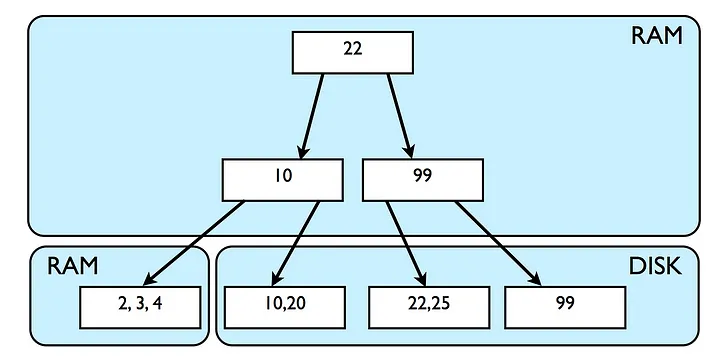 The rows we insert are leaf of B-tree. Index to these data in B Tree structure mostly in RAM to guarantee faster access to the original data. When the data is too large and RAM is out of space then database will read from the disk. Disk I/O is very costly, B Tree is a random read/write, in-place replacement, very compact & self balancing data structure which suffers from disk I/O limitation.